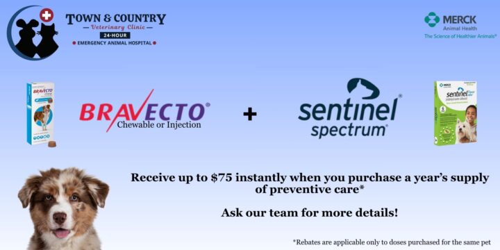 Annual bloodwork is vital in tracking subtle changes in your pet’s health. Wellness panels provide Town and Country’s Veterinary Clinic’s doctors with a medical baseline to aid in the early detection of abnormalities such as heartworm and parasitic diseases, thyroid, kidney, and liver function, and inflammation. Take an additional $10 off a panel and confirm your pet’s optimal health!